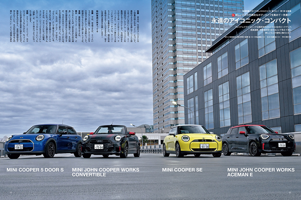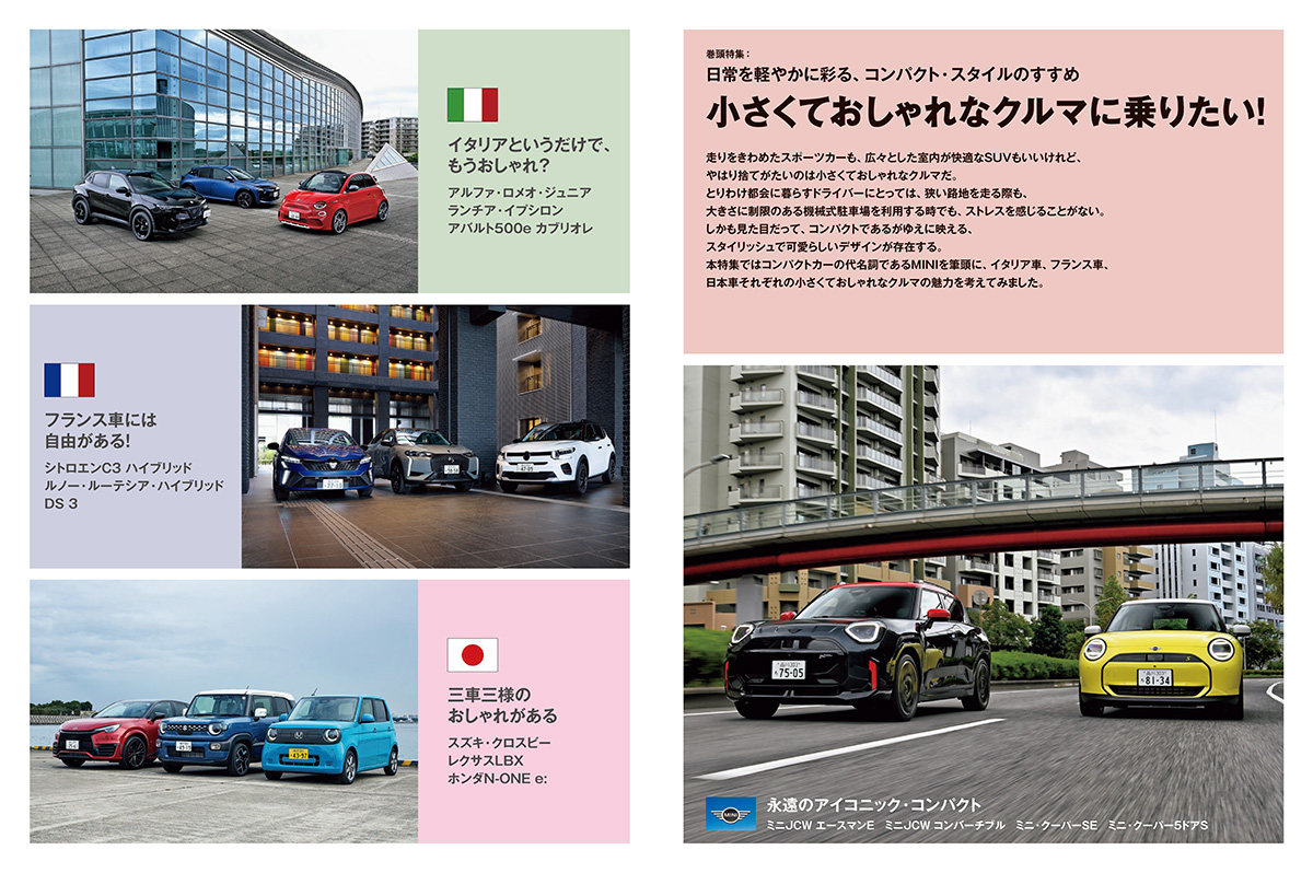 そして巻頭では、ポール・スミスさんのミニにあわせて小さくておしゃれなクルマを特集します。おしゃれでコンパクト、といえば、やはりフランス車でしょうか。フィアット500のようなイタリア車だってあります。もちろん小さくて可愛らしいクルマなら国産車だって負けてはいません。見た目はもちろん、走りの気持ち良さも重視したエンジンならではのセレクション、ご期待ください。