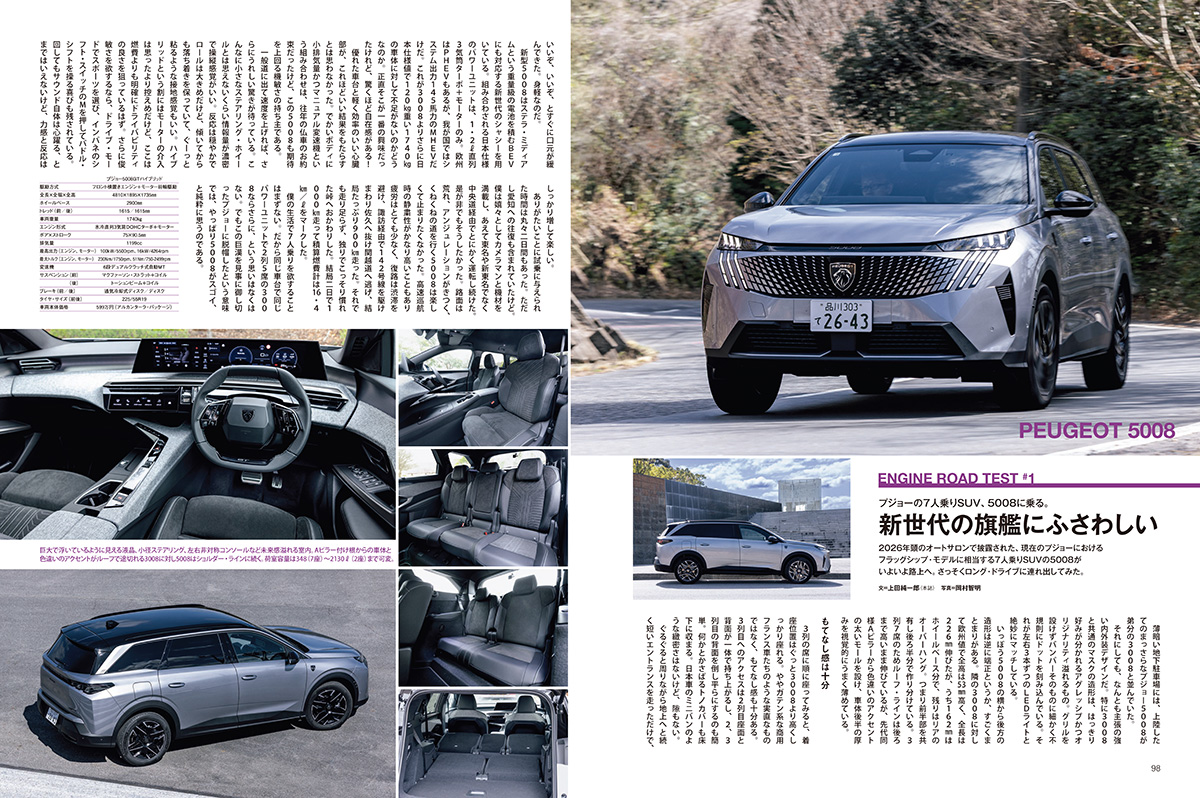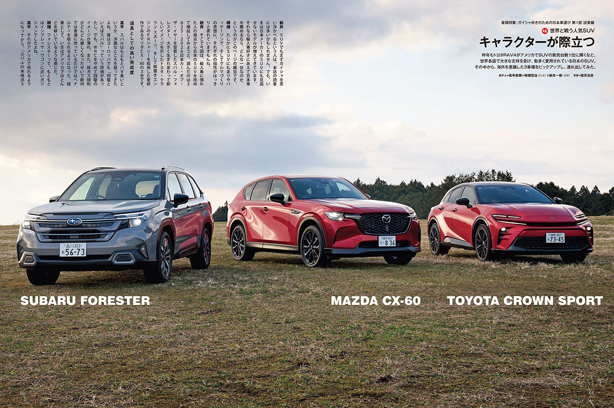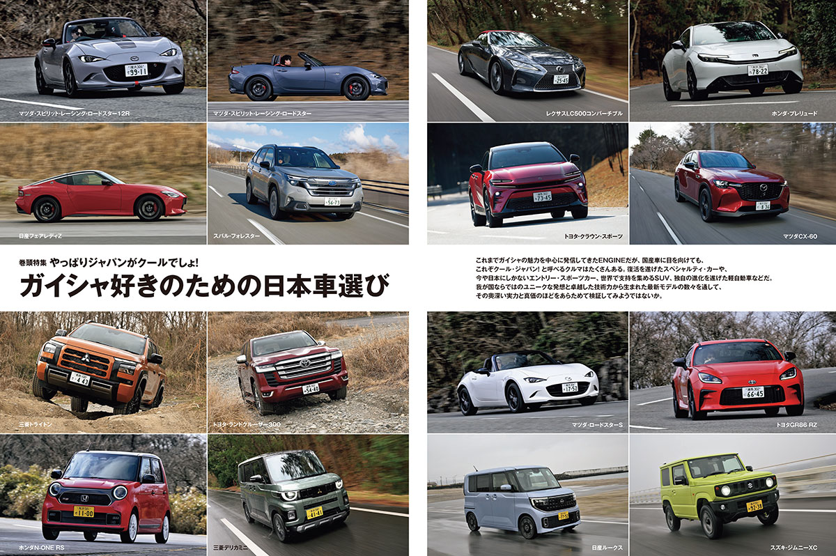 今月号のエンジンでは、久々に日本車の大特集を組みました。エンジンといえば、ガイシャを連想される読者のみなさんも多いことでしょう。というわけで今回の特集のテーマは「ガイシャ好きのための日本車選び」です。まずはエンジンの人気投票で2年連続のHOT1に輝いたマツダ・ロードスター。この人気のライトウェイトスポーツからは、限定200台が瞬く間に売り切れたマツダ・スピリットレーシング・ロードスター12Rが登場します。さらに表紙を飾る三菱アウトランダーPHEVや日本カー・オブ・ザ・イヤーを受賞したスバル・フォレスターといったSUV、そして近年の技術的進歩が目覚ましい軽自動車まで、日本が世界に誇るクルマが勢ぞろいしています。