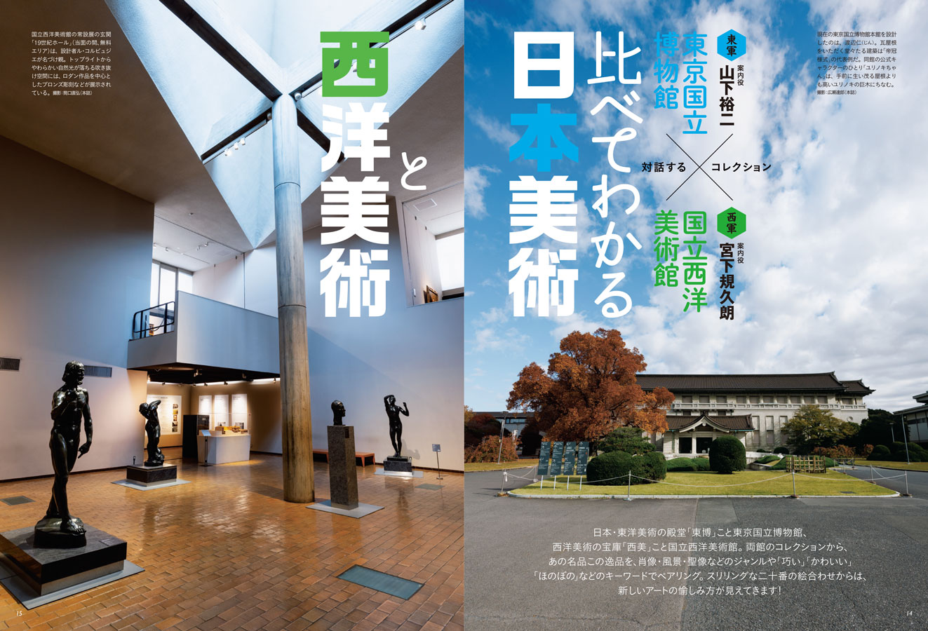 日本美術、西洋美術の優れたコレクションを有する上野の両雄、東京国立博物館と国立西洋美術館。人気の特別展・企画展の会期終了まぢかには、しばしば長蛇の列ができることも。ところで、どちらも特別展・企画展の半券を持っていれば、その日の常設展(コレクション展示)を無料で見られるってご存じでした? それに、東京国立博物館は1000円、国立西洋美術館は500円を払えば、原則いつでも常設展を見られます。つまり1500円あれば、上野で半日、日本にある最も優れた美術品を楽しむことができるのです。 今号の特集では、山下裕二先生(明治学院大学教授)を東博の応援団長、宮下規久朗先生(神戸大学教授)を西美の応援団長に迎えて、日本(東洋)美術と西洋美術による二十番の絵合わせを試みました。大学時代から知り合いだったおふたりですが、意外なことに対談は初めてとのこと。豊かな知識に基づきながら、それぞれのユニークな視点からとびだす発言には、「え? ほんとに?」「そんなストーリーが隠されていたとは知らなかった!」など、驚かされることがいっぱい。今号を片手に、“わたしたちの国立博物館・美術館”を有効活用しましょう。