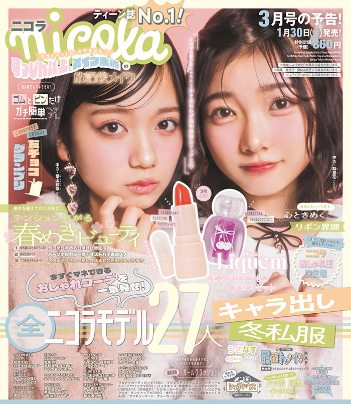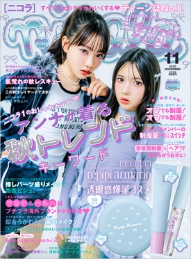 発行部数ナンバーワンのティーン向けファッション誌。流行のファッション、ビューティ、学校ネタを中心に、中学生活が楽しくなるコンテンツが盛り沢山。読者イベント、SNS、動画など多くの接点をもっています。モデル(通称ニコ(モ))はすべて専属で新垣結衣さん、川口春奈さん、永野芽郁さんらを輩出しています。