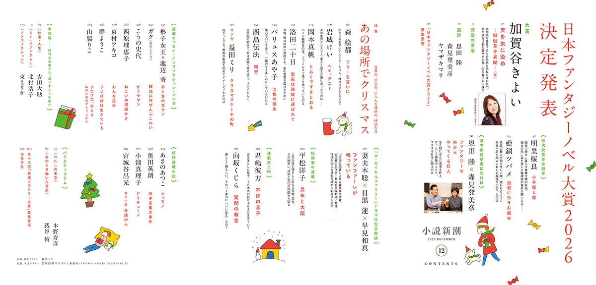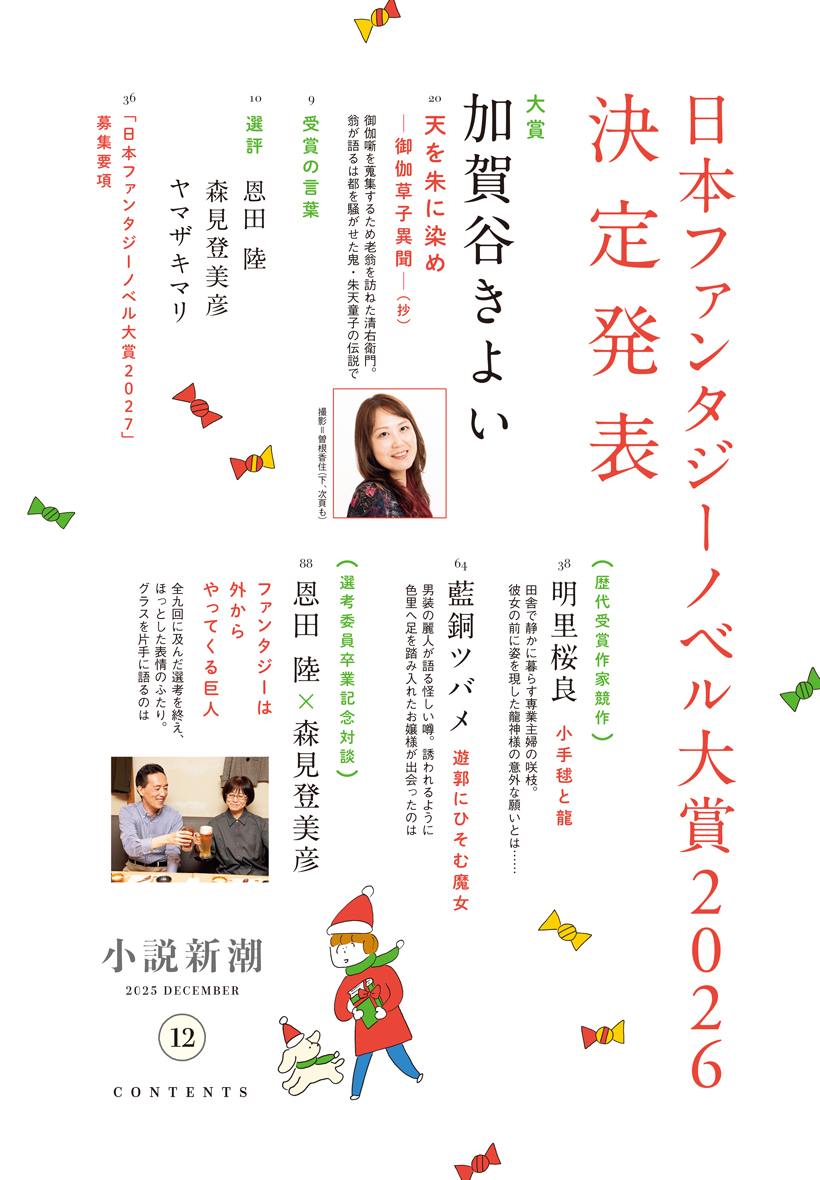 何度立ち会ってもわくわくする、新人賞の選考会。日本ファンタジーノベル大賞2026は、加賀谷きよいさんの平安エンタメ小説「天を朱に染め」に贈られました。本誌ではその抄録と選評を掲載、さらに今回で選考委員を退任される恩田陸さんと森見登美彦さんの対談は、さながら選考会の延長戦のよう。これまでの思い出からファンタジーとは何かという激論、果てはそれぞれの創作論まで、新人賞応募者だけでなく小説に関わるすべての人必読です。