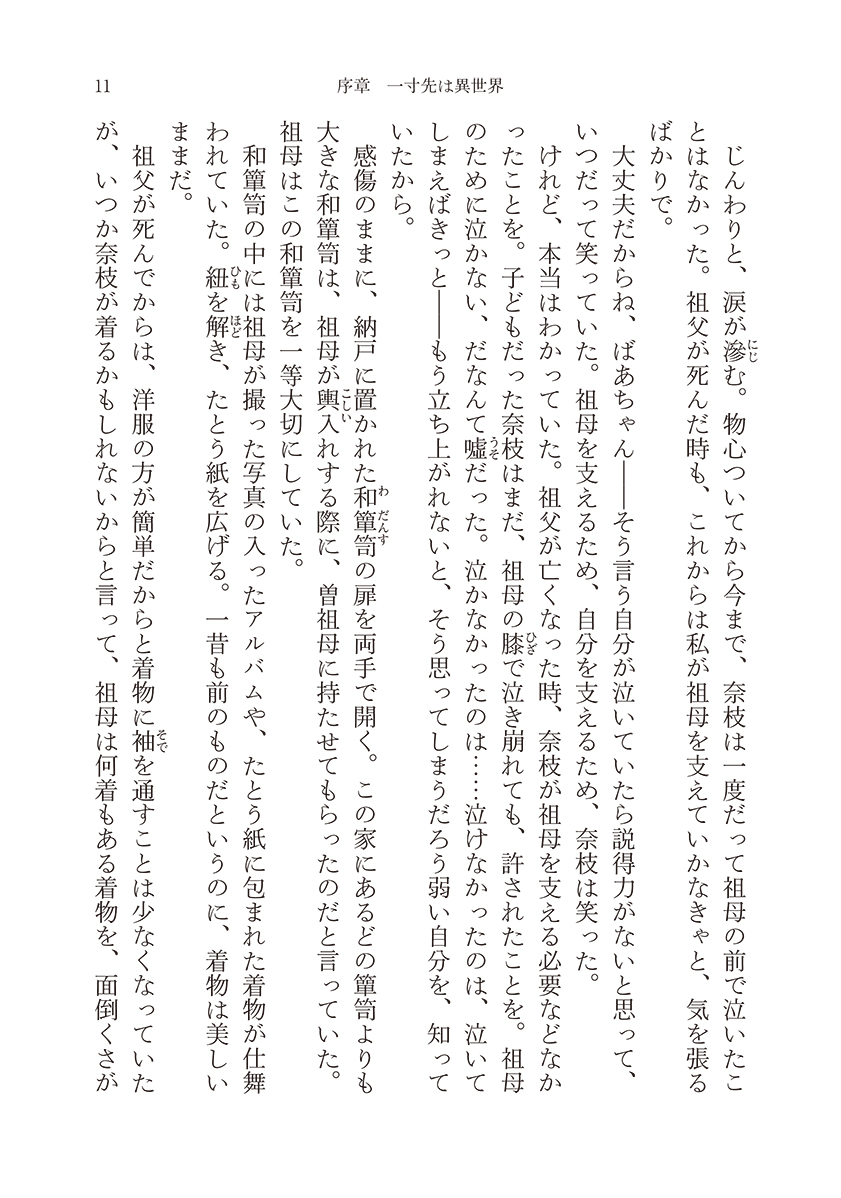 祖父が死んでからは、洋服の方が簡単だからと着物に袖を通すことは少なくなっていたが、いつか奈枝が着るかもしれないからと言って、祖母は何着もある着物を、面倒くさがらず都度、虫干ししていた。晴れた日の軒下にはためく着物の波の中を、駆け回るのが奈枝は幼い頃から好きだった。