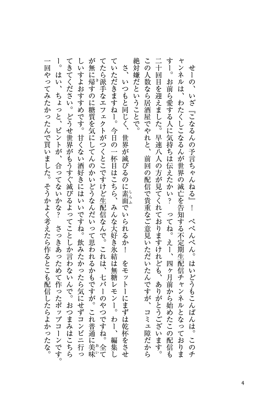 せーの、いざ『こなるんの予言ちゃんねる』! ぺぺんぺん。はいどうもこんばんは。このチャンネルは、わたくしこなるんが世界の滅亡を告知する不定期生配信チャンネルとなっておりますー。お前ら愛する人に気持ちは伝えたかい? ってね。えー、四ヶ月前から始めたこの配信も二十回目を迎えました。早速八人の方が見てくれておりますけれども、ありがとうございます。この人数なら居酒屋でやれと、前回の配信で貴重なご意見いただいたんですが、コミュ障だから絶対嫌だということで。