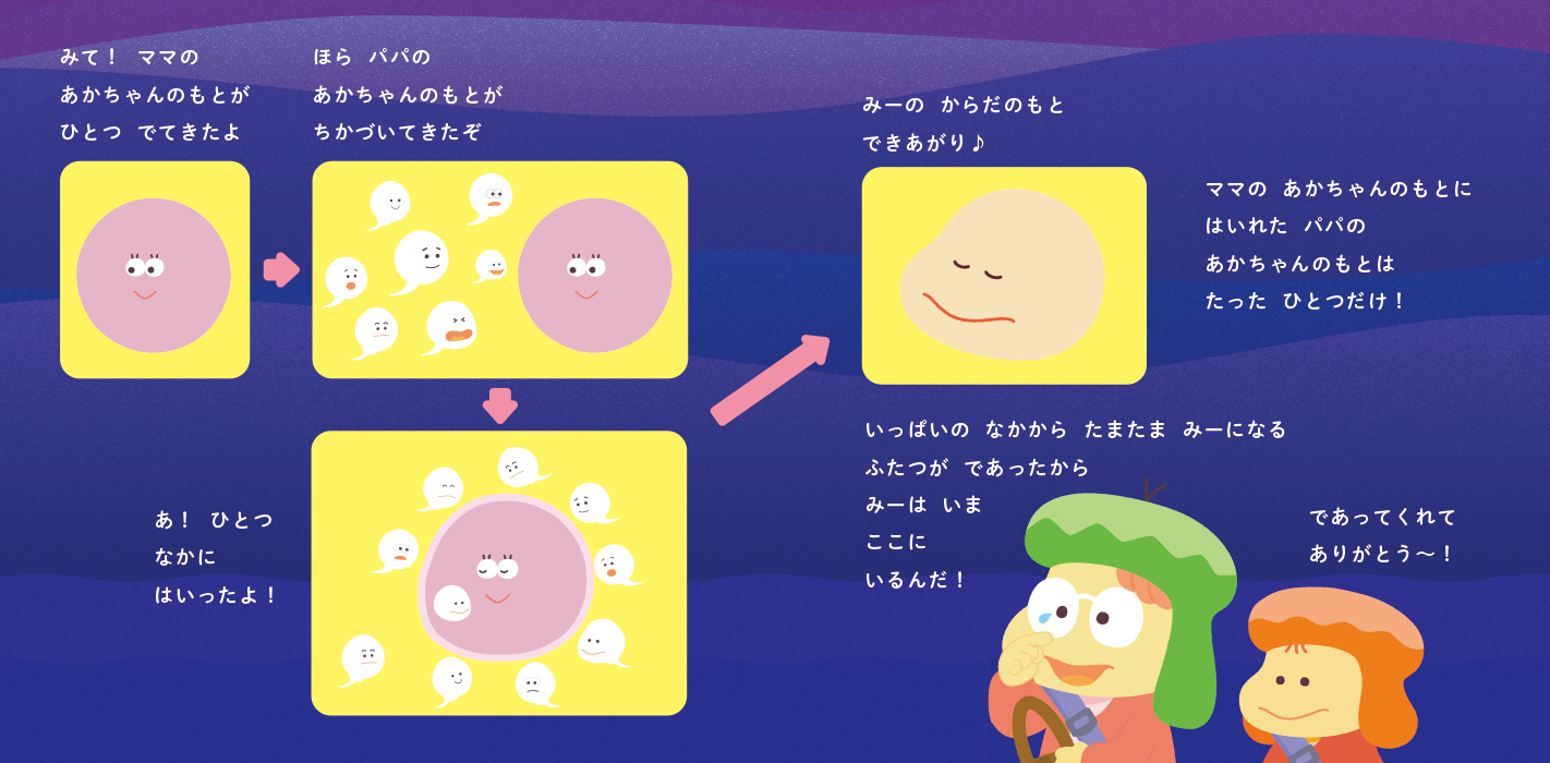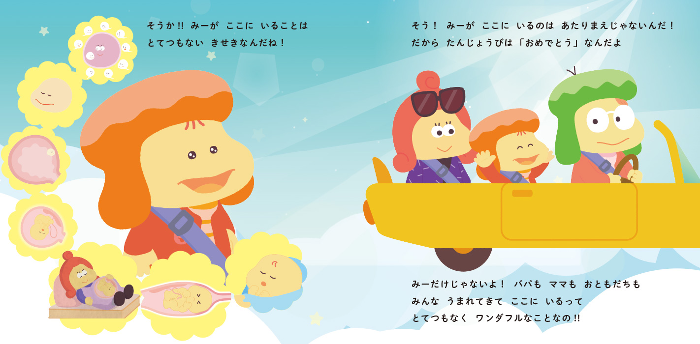 「うまれたことがなんですごいの?」という絵本のテーマ、自分自身の経験からもすごく共感しました。僕は今、子どもが2歳になったばかりですが、赤ちゃんを授かったときも、エコーで「ここが指になってきますよ」「手足になってきますよ」って見せてくれるのも、ちっちゃいのにバクバクバクバク心拍数を感じたりするのも「すごい」と思いました。絵本でもパパとママの「あかちゃんのもと」の話がありましたが、僕とパートナーの「あかちゃんのもと」が結びついて、人間のかたちに形成されていくのがもうすごいこと。絵本でも「みーがここにいることはとてつもないきせき」ってありましたけど、まさにそうで。パートナーの妊娠中は、いつ壊れてしまうかわからないガラスの宝物みたいなものをずっと抱えているような感覚でした。妊娠中の大変なことをたくさんクリアして、パートナーがお腹を痛めてやっと赤ちゃんが生まれてきたときに、「そうか、自分もこれを経験して今があるんだ」とわかったし、大切にしなきゃいけないなと思いました。僕たちは奇跡的に授かれたんだから、真摯に向き合って寄り添っていくべきだなと思うし、自然にそうなりますね、やっぱ。