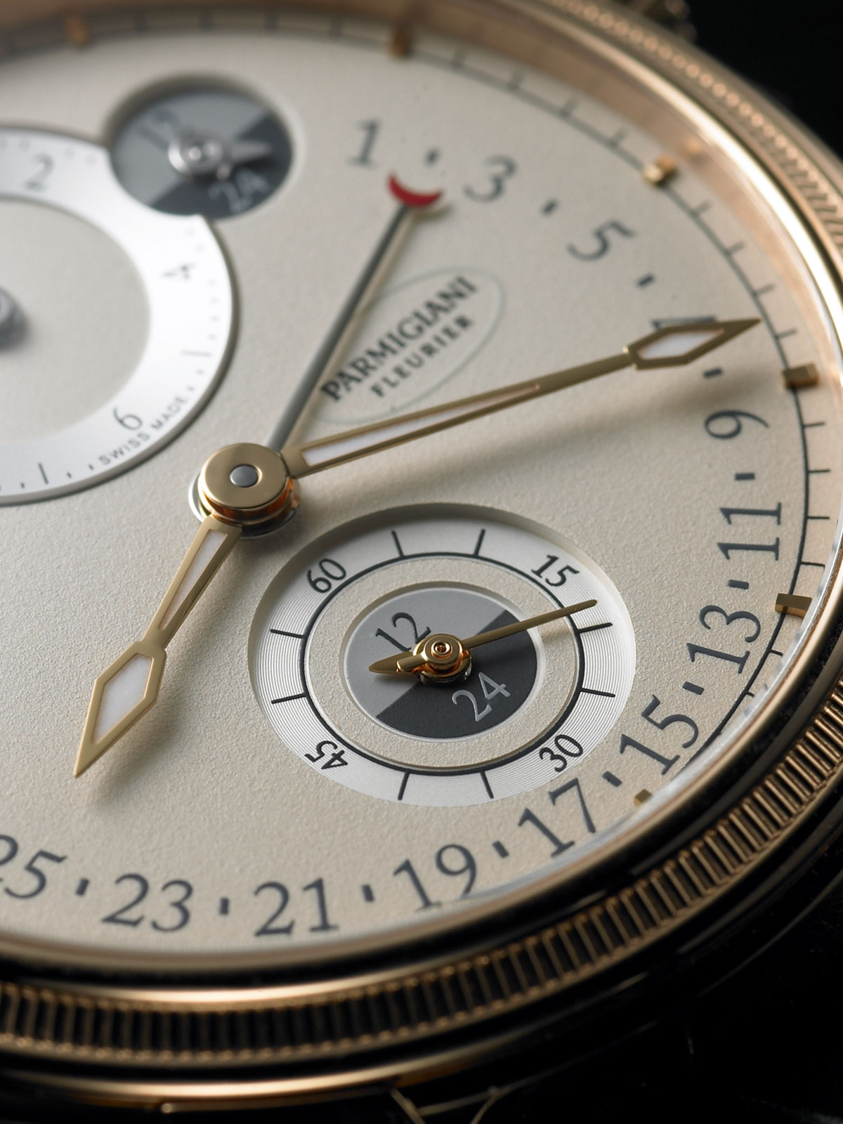 トリック エミスフェールのムーブメントは、2つの時間帯の時刻表示を分単位の精度で1つのムーブメントで制御するという極めて複雑なもの。2つのムーブメントを1つのケースに収めた古の懐中時計の修復を依頼された、稀代の時計師ミシェル・パルミジャーニ氏は、その時計にインスパイアされ、この旅する人のための高性能な時計を考案した。上質な和紙の表面のような、ダイアルの繊細な仕上げもすばらしい。