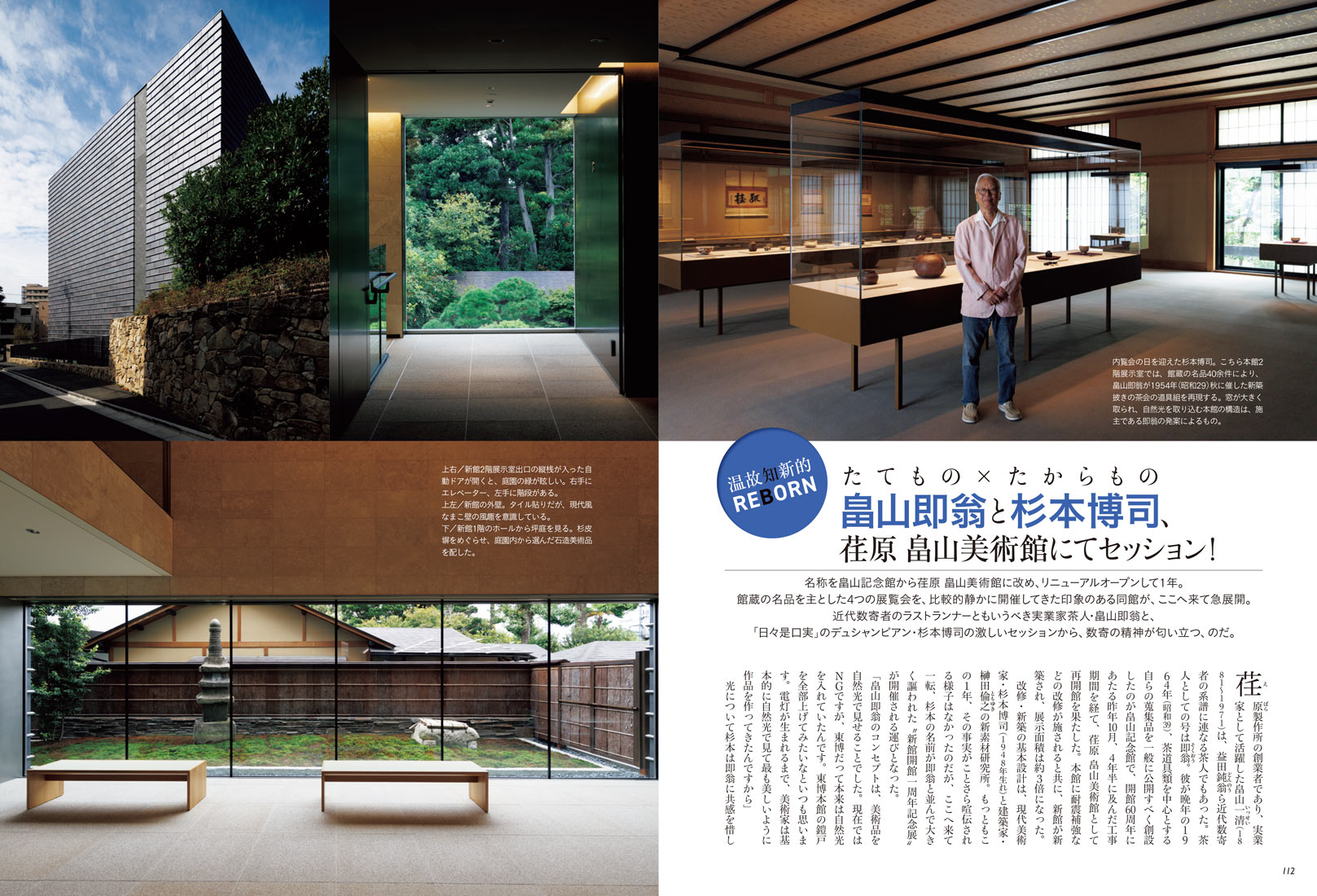 特集は「東京とアート」。アートの視点で東京の今に迫る試みだ。「丸の内」「京橋・日本橋」「六本木・麻布」「天王洲・芝浦」「両国・蔵前」──上野はあえて除外しての5エリアを、美術館やギャラリーだけでなく、カフェやフードにも目配りしながら探訪すれば、日ごろ自分がいかに固定化したルートを回るだけだったか反省することしきり。ルートを少し外れた処にあるさまざまとの出会いがなんと新鮮なことか。一連の取材の最後に訪れたのは、ちょうど1年前の秋に新装再開館した荏原 畠山美術館である。折しも始まった〈「数寄者」の現代〉展は、近代の実業家茶人・畠山即翁と現代美術家・杉本博司の激しいセッションの趣きで、アートの現場としての東京の可能性を強く感じさせる心躍る展観だった。