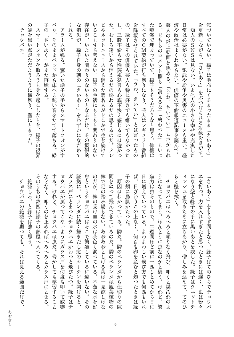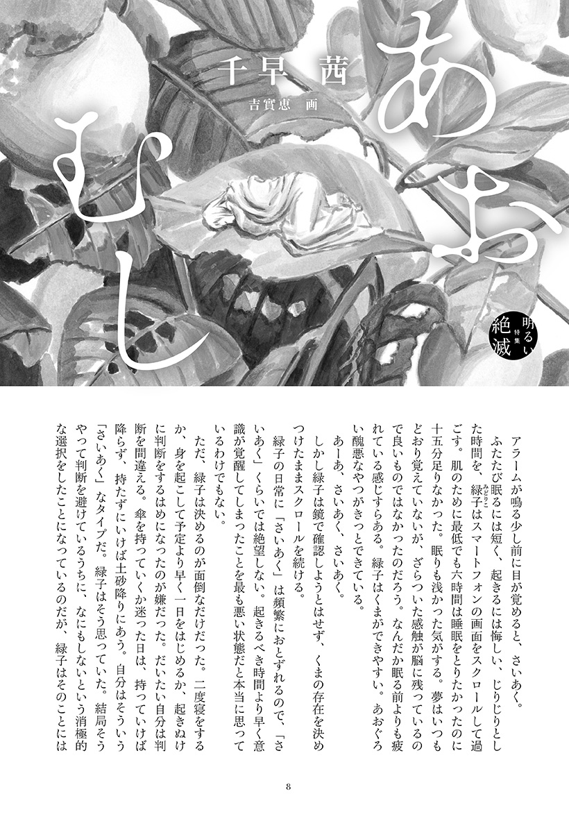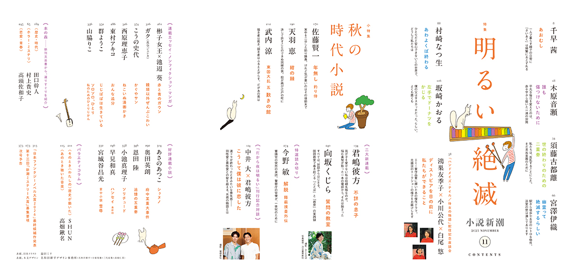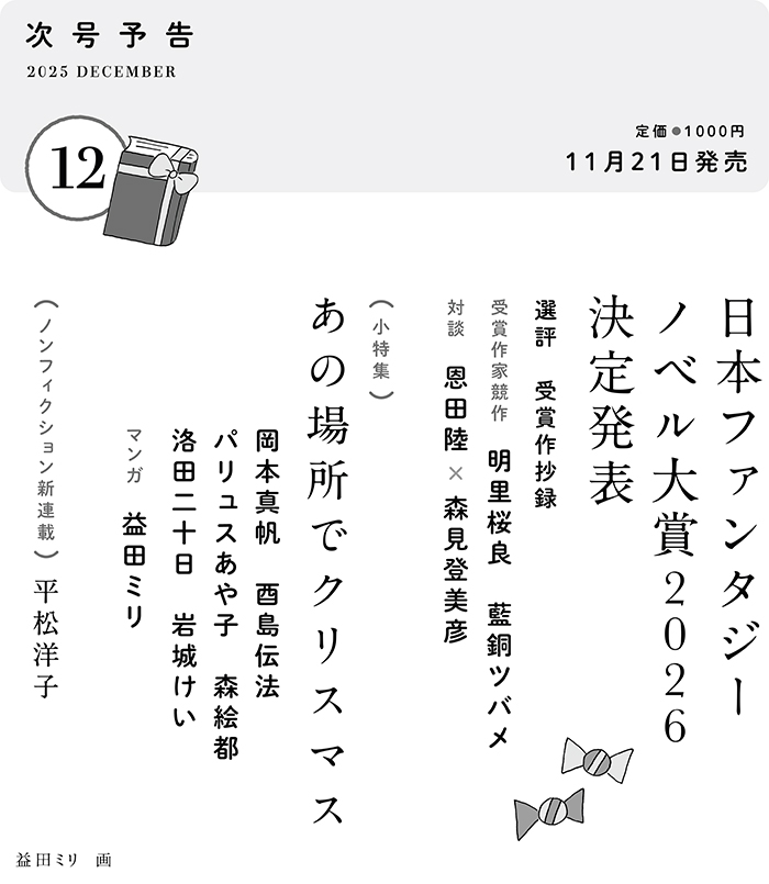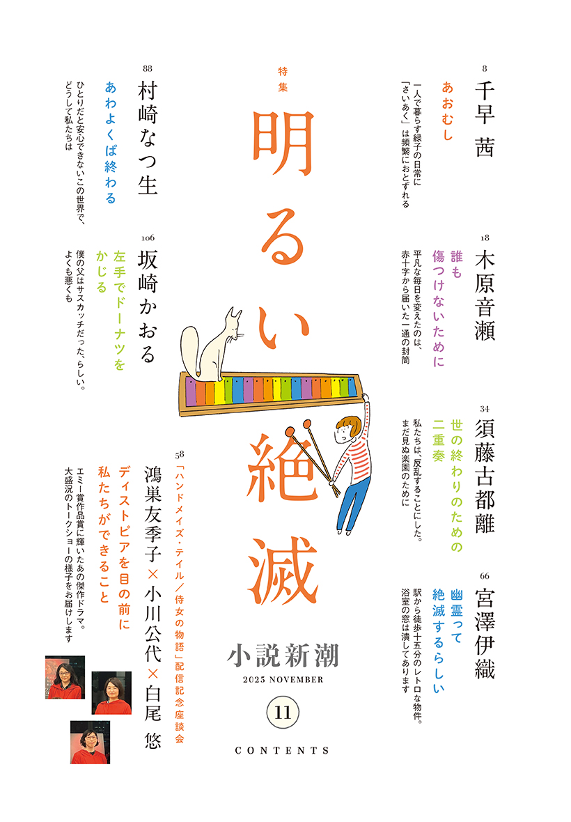 ♪日に日に世界が悪くなる~と毎朝テレビから流れてくるこのご時世。思わず〈ほんまやで〉と頷いてしまいます。だけど鬱々していても、想像することはできるはず。たとえばほら、世界がなくなるとか。ということで今号の特集は「明るい絶滅」。千早茜さん、坂崎かおるさん、初登場の木原音瀬さんなど六編の力作が揃いました。絶滅してほしいもの(すべての偏見)、そうでないもの(マイナー言語)、いろいろありますが、いつか来る終わりを感じることができたら、今の現実も悪くないと思えるかもしれません。