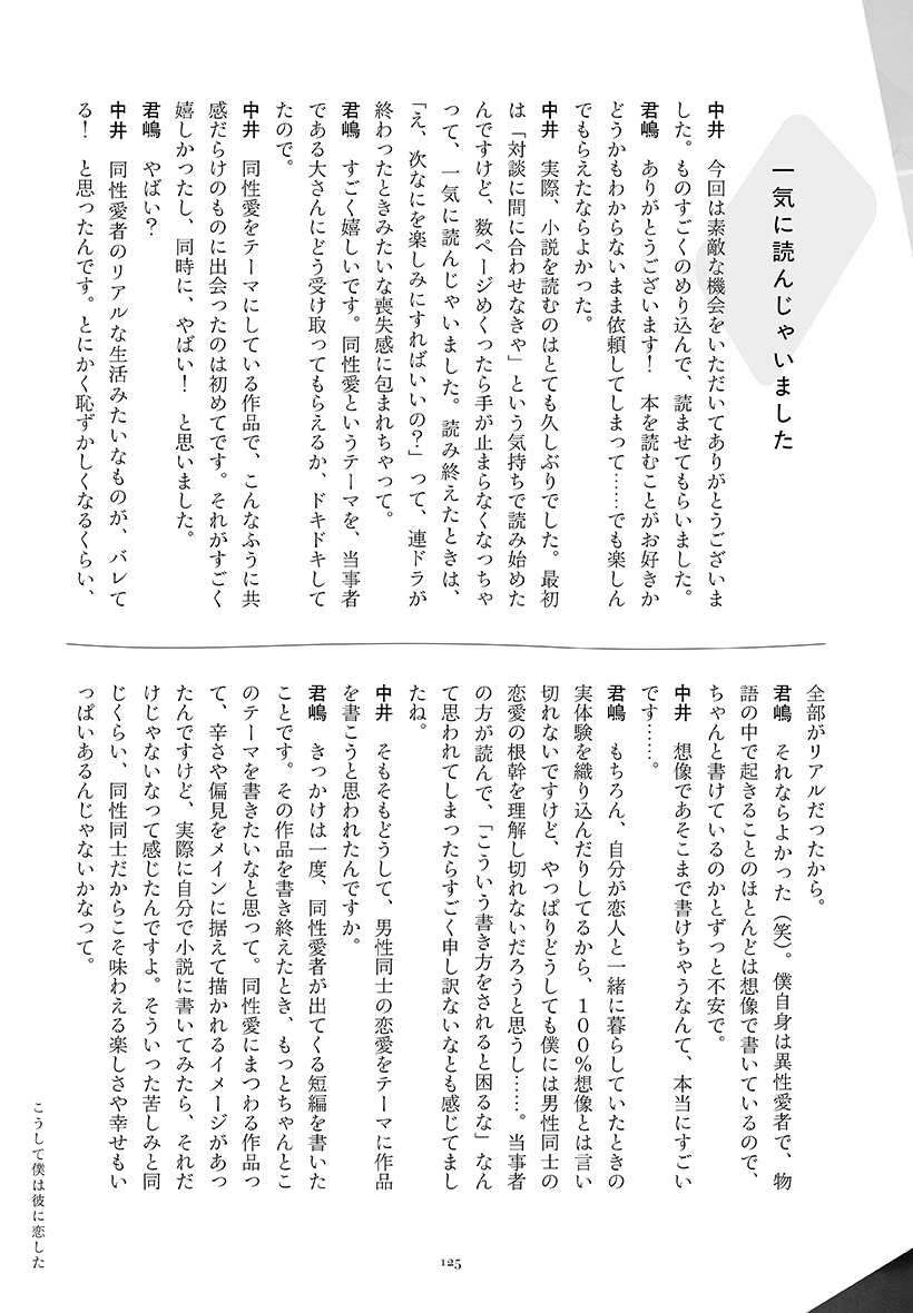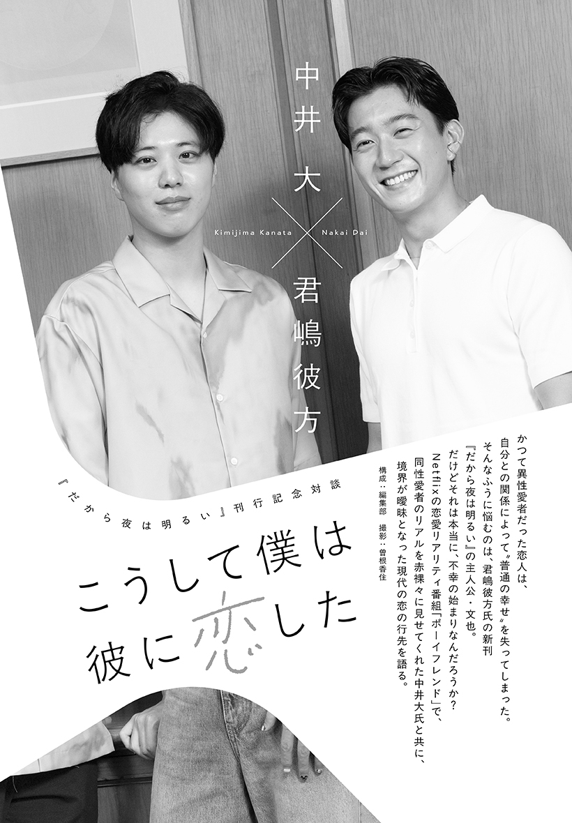 君嶋彼方さんの長編『だから夜は明るい』を読み、「同性愛者のリアルな生活みたいなものが、バレてる! と思った」と熱く語るのはタレントの中井大さん。そう、恋愛リアリティ番組「ボーイフレンド」で生まれたカップル「DaiShun」のダイさんです。同性愛者の恋愛を描く本作をのめりこんで読んだというダイさん、詳しい感想はぜひ誌面にて!