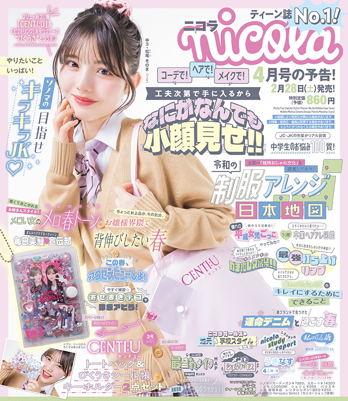 ニコラとニコ☆プチと、両方の編集長を務めるようになってから一ヶ月が経ちました。ずっとニコ☆プチ育ちでしたので、月刊誌のサイクルは本当に早くて私自身がついていくのが精一杯。この前企画会議をしたばかりなのに、「え、もう次の企画会議!?」と内心大慌てになっているのを編集部員には隠しています(笑)。ニコラの企画選びで気をつけているのは、中高生だからといって子供だと思わないこと。我々大人が考えているよりずっと大人であることを常に念頭に置いています。現場を担う編集部員はニコラ専属モデルや読者モデルとコミュニケーションをよく図っていて、そこからリアルな企画が生まれます。「ニコラ3月号」では専属モデル27人の私服企画で等身大のファッションを。ティーンにとっての「打ち上げ」のリアルや、目立ちすぎずちょうどよく盛れるクラス会コーデなど、今の中高生のライフスタイルにぴったりな特集が揃っているので、お楽しみに!