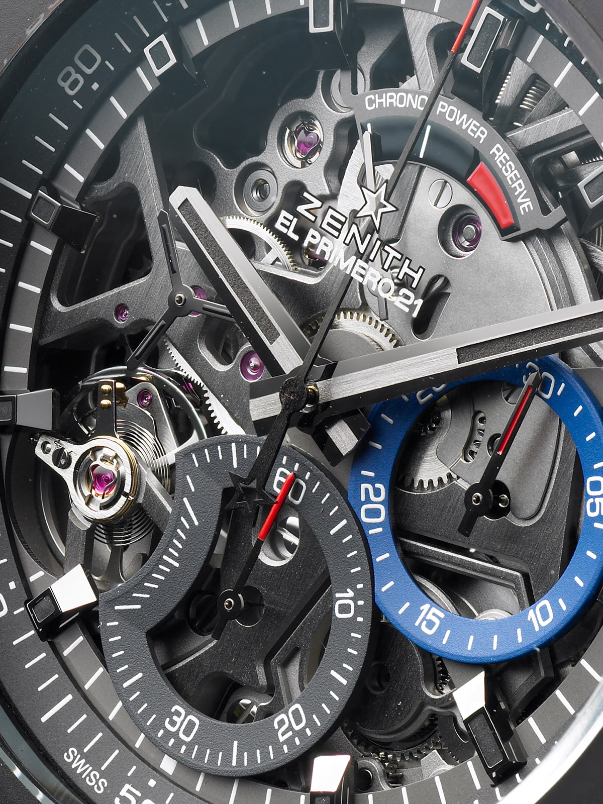 2つのインダイアルは、3時位置が30分、6時位置が60秒の各積算計で、これら2つはダイアル側にある10振動テンプが調速を担う。100振動と10振動。積層する2つのクロノグラフ機構を完全に一体化させている。ゼニスは再びクロノグラフを革新してみせた。