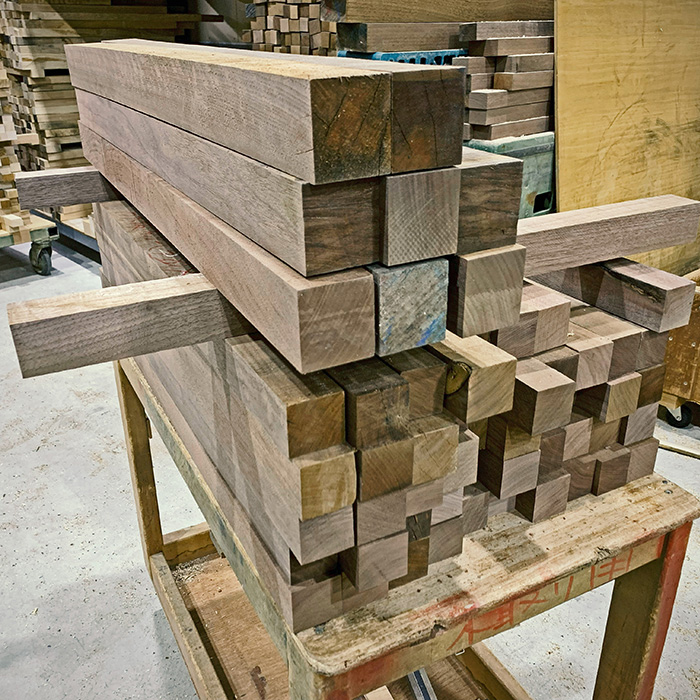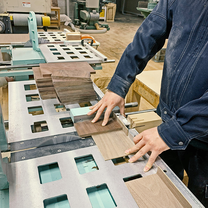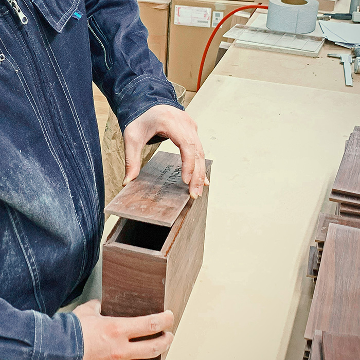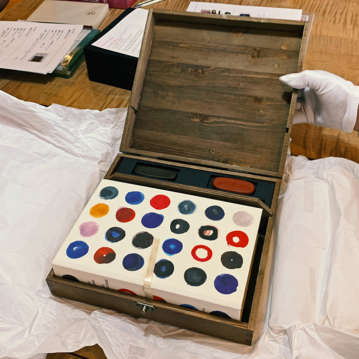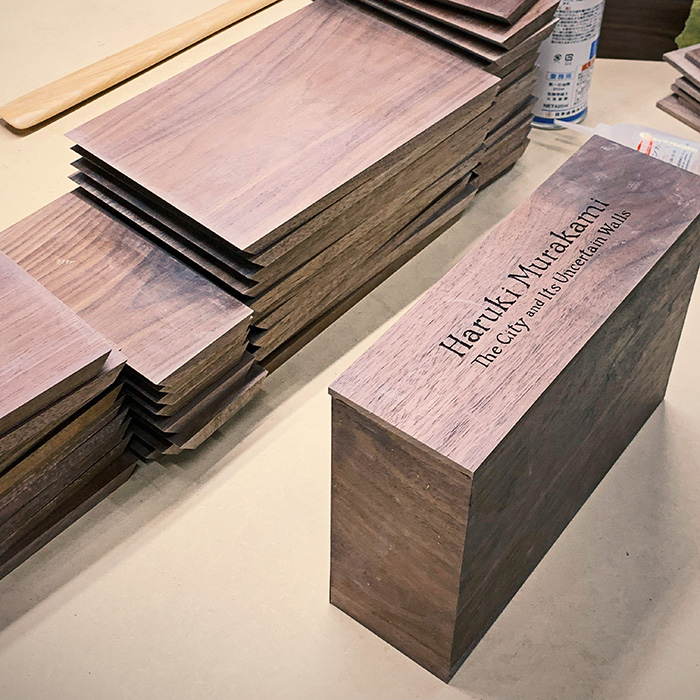 装幀者は八方手を尽くし、いくつかの会社に製作を打診しましたが、「愛蔵版」にふさわしい精密で美しい函を作ってくれる会社になかなかたどり着けません。ようやく出会ったのが、渋谷区恵比寿にある白崎ケース店でした。1901年創業の老舗で、宝石箱や装飾品を入れるケースを製作している会社です。製作工房は北海道の旭川にあり、見学に行くことはかないませんでしたが、2023年初夏、“haruki”とサインが刻印された美しい無垢ブラックウォルナット製の試作品が届いた時には、愛蔵版チームの面々は思わずつぶやきました。