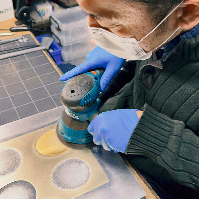 厚さ0.8mmの真鍮板から卵形を切り抜き、手作業で一枚ずつ丁寧に研磨し、題字を刻印した後、仕上げ加工を行ってプレートが完成します。