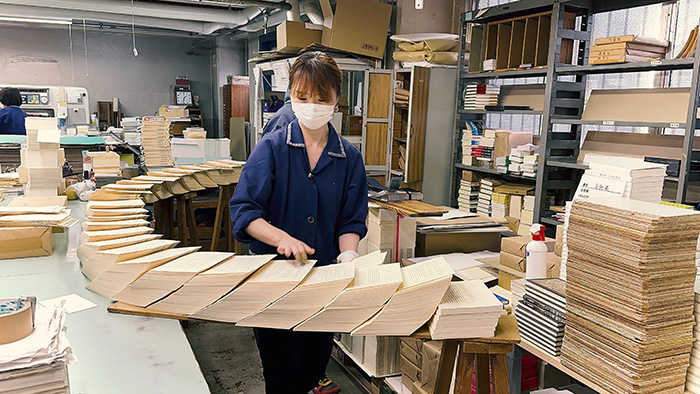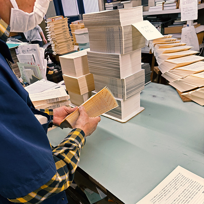 8頁ひとまとまりになったもの(「折」と言います)を最後の折(657~664頁)から1折(1~8頁)まで、手作業で一折ずつ、素早く丁寧に重ねていきます。浅岡奈緒さんと工藤陽平さんが正確かつリズミカルに手を動かし、常田喜一さんと菊池通子さんが背を揃えながら検品していきます。呼吸の合ったその作業に、しばし見入ってしまいました。