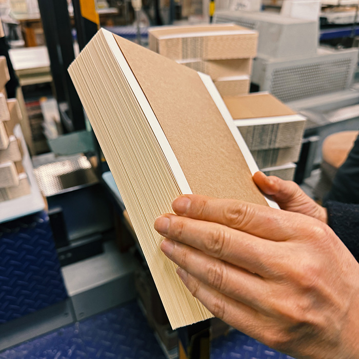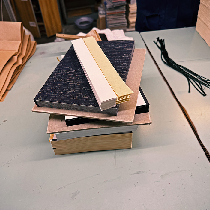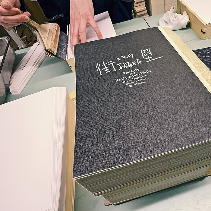 『愛蔵版 街とその不確かな壁』の販売数は、限定300部。製本工程の多くは手作業で行われます。加藤製本の渡邊貴菜さんと沖山純子さんが作った束見本をもとに表紙まわりの装幀が進んでいくなか、本文の製本作業も進んでいました。