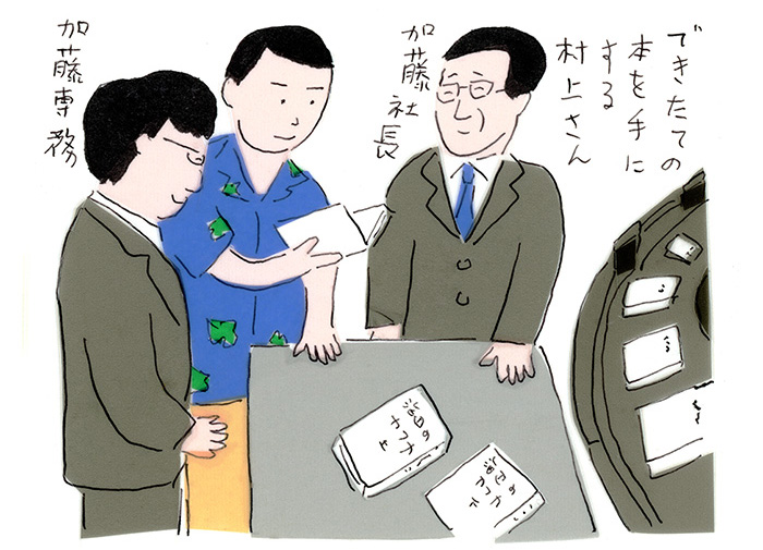 じつは村上春樹さんは単行本『海辺のカフカ』刊行半年後の2003年春、安西水丸画伯と加藤製本の工場を見学に訪れています。刊行後に、特設サイトで行われた村上さんと読者とのメールのやりとりを収録した単行本『少年カフカ』(2003年6月刊)に、「加藤製本見学記」としてカラーイラスト入りで掲載されています。