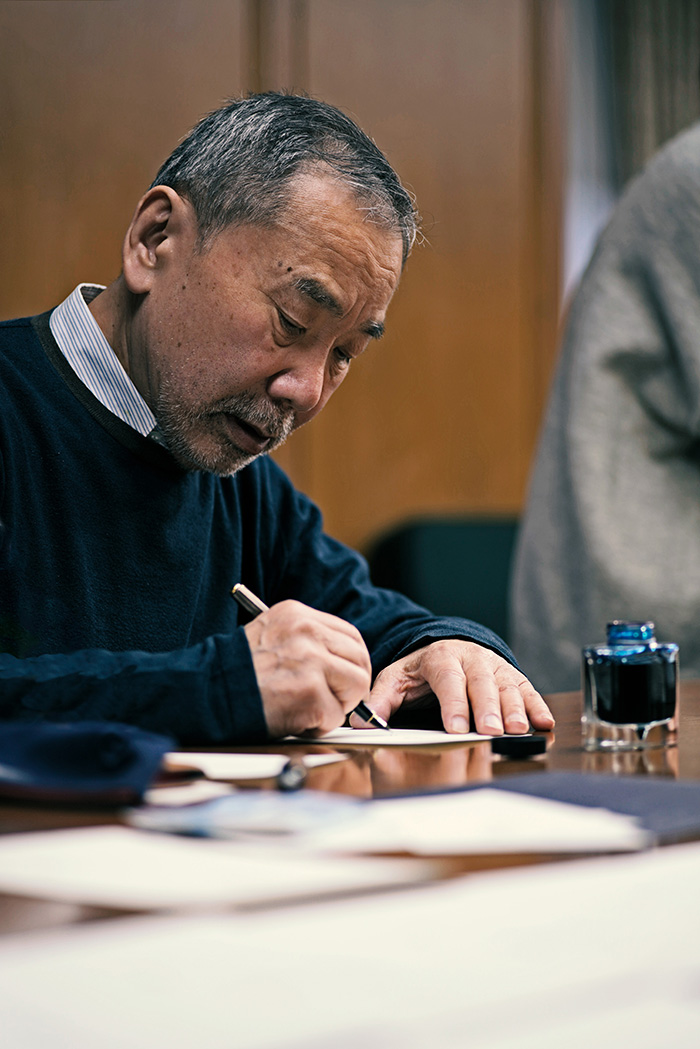 万年筆で書かれた「春樹」の二文字とシリアルナンバー……書き終えたサインが広い机の上に並べられていきます。