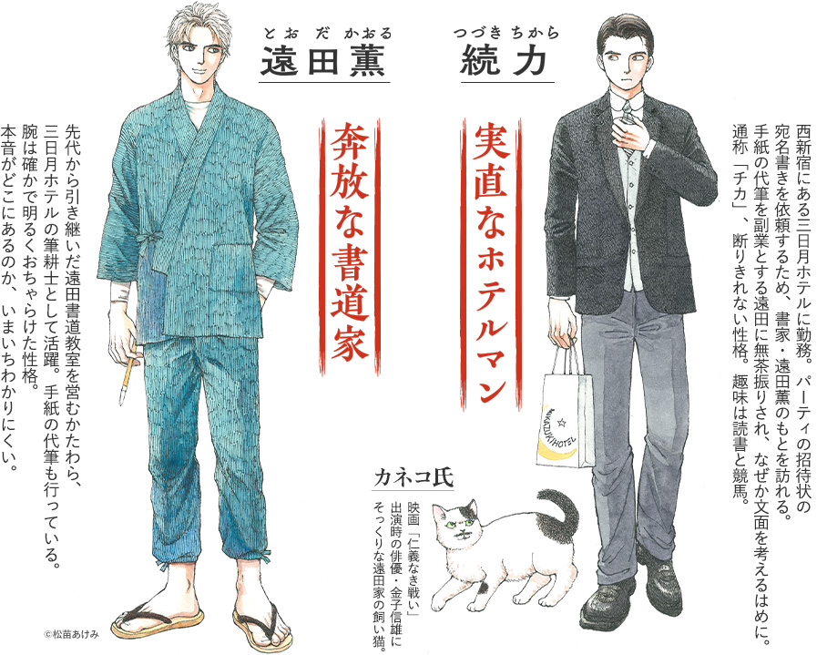 都内老舗ホテル勤務の続力は、招待状の宛名書きを依頼しに書家の遠田薫を訪ねるも、なぜか手紙の代筆を手伝うはめに。遠田が自在に書き分ける筆跡に魅了された続は、やがて文字にこめられた人々の思いと、遠田の秘密に触れることになり――。AmazonのAudible(朗読)との共同企画、配信開始ですでに大人気の書き下ろし長篇小説。