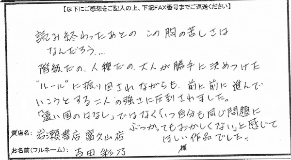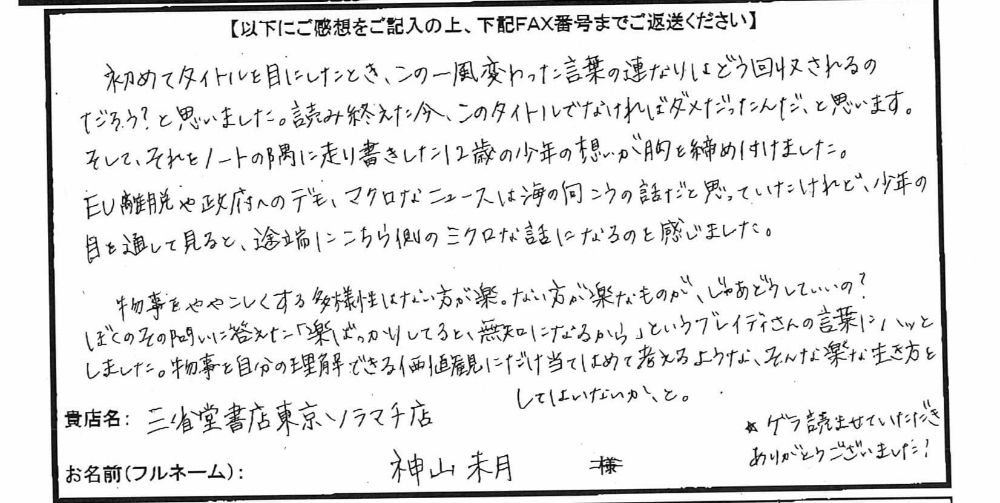 発売前に書店員さんからいただいた熱いご感想は、なんと140件以上──。驚きと感動とともに、この作品が持つ“力”をさらに確信することができました。みなさまのおかげで、今、多くの方々にこの本を届けることができています。本当に、ありがとうございます!! (編集H&新潮社「チーム・ブレイディ」一同)